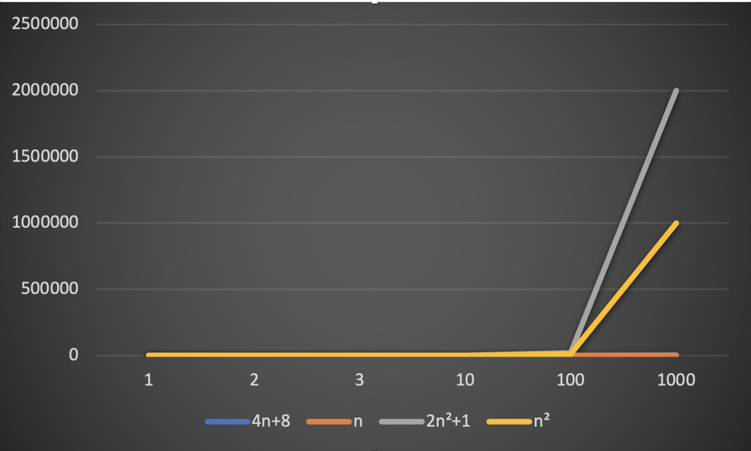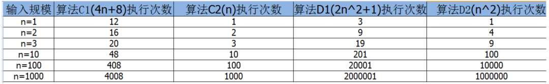 从上述折线图我们可以看出,随着数据规模n的增加,C1和C2近乎重叠,再比较C系列算法和D系列算法,可以看到随着n的增大,即使不考虑n²前的常数,D系列执行次数也是远远超过C系列算法的。所以我们可以得出下面这个结论: