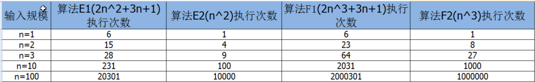 从上述折线图我们可以看出去,E2和F2当n大于10之后,F2的执行次数远远的超过了E2的执行次数。