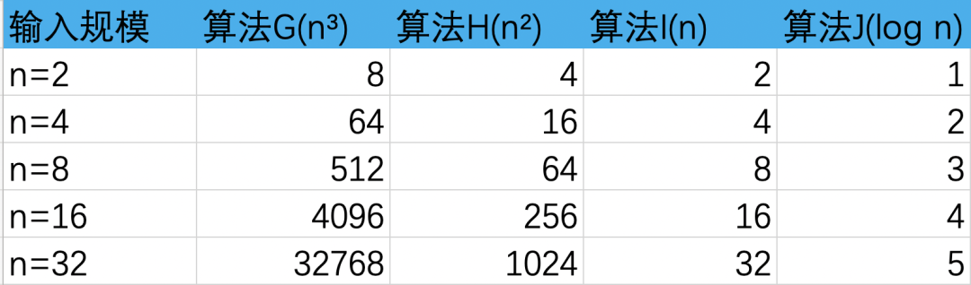 算法的时间复杂度是一个函数,用来描述算法的运行时间,一般使用大O符号表示,所以一个算法的时间复杂度我们可以说是O(f(n)),f(n)我们这里表示算法需要执行的次数,n代表数据规模。下面我们通过几个例子介绍相同需求下的不同算法的时间复杂度。