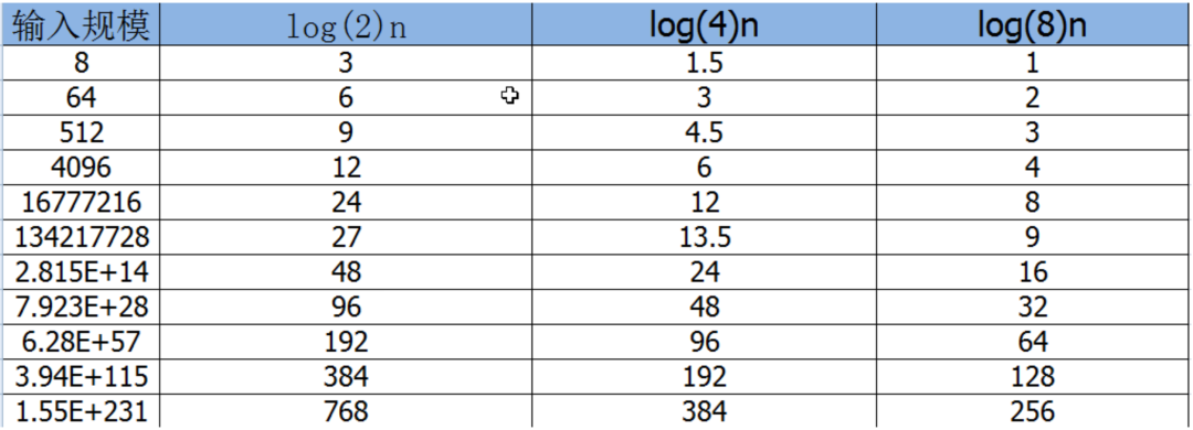 这里说一下logn,一般情况下,我们说的都是以2为底的对数函数,但是在推导时间复杂度的逻辑上,可以是2、3、4(任何数字为底都可以)。