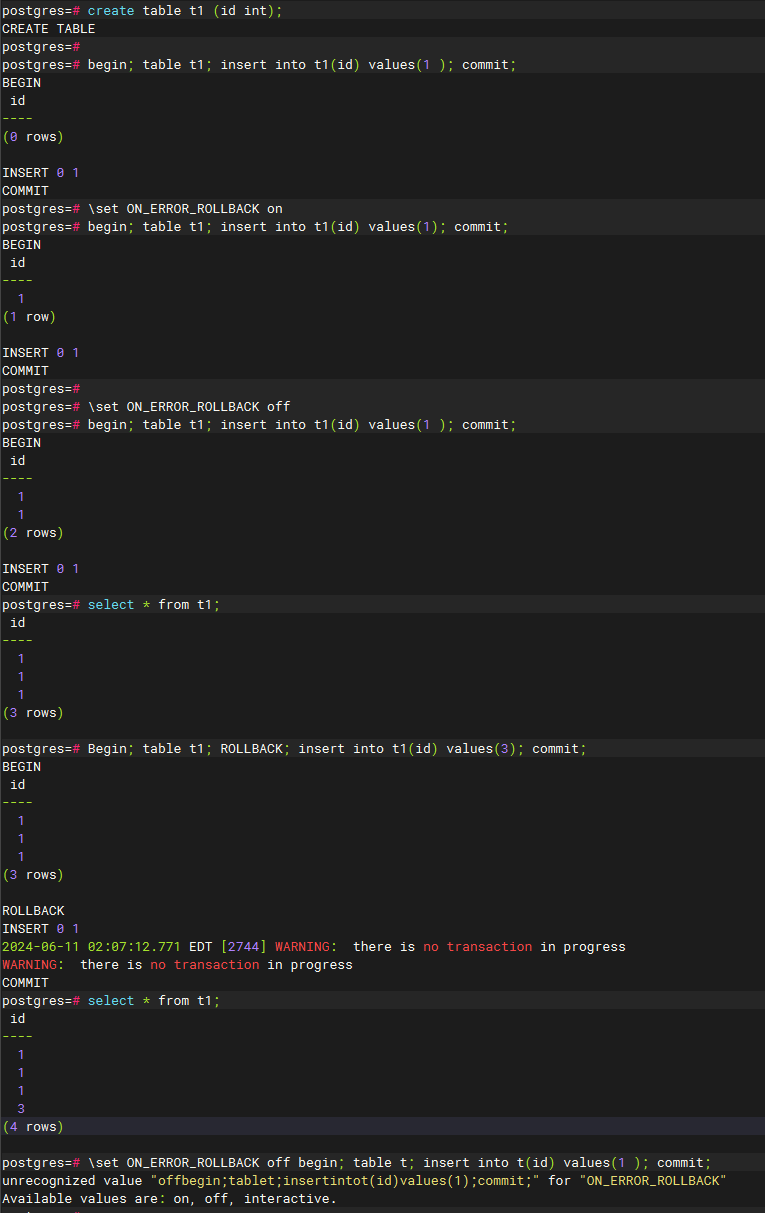 C. \set ON_ERROR_ROLLBACK off begin; table t; insert into t(id) values(1 ); commit;