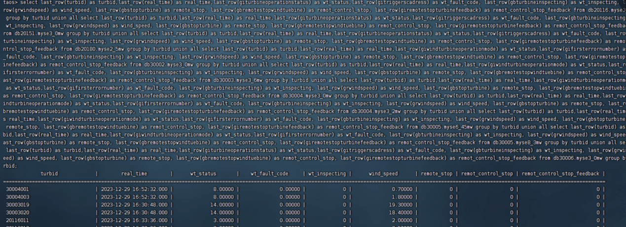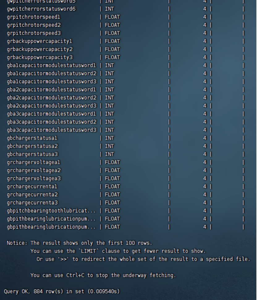 风电机作为一种利用风能来产生电力的大型设备。需要监控的指标十分之多。因此,在建模环节就有不小的难度。以下是一个 describe 超级表的输出,达到了 884 列。