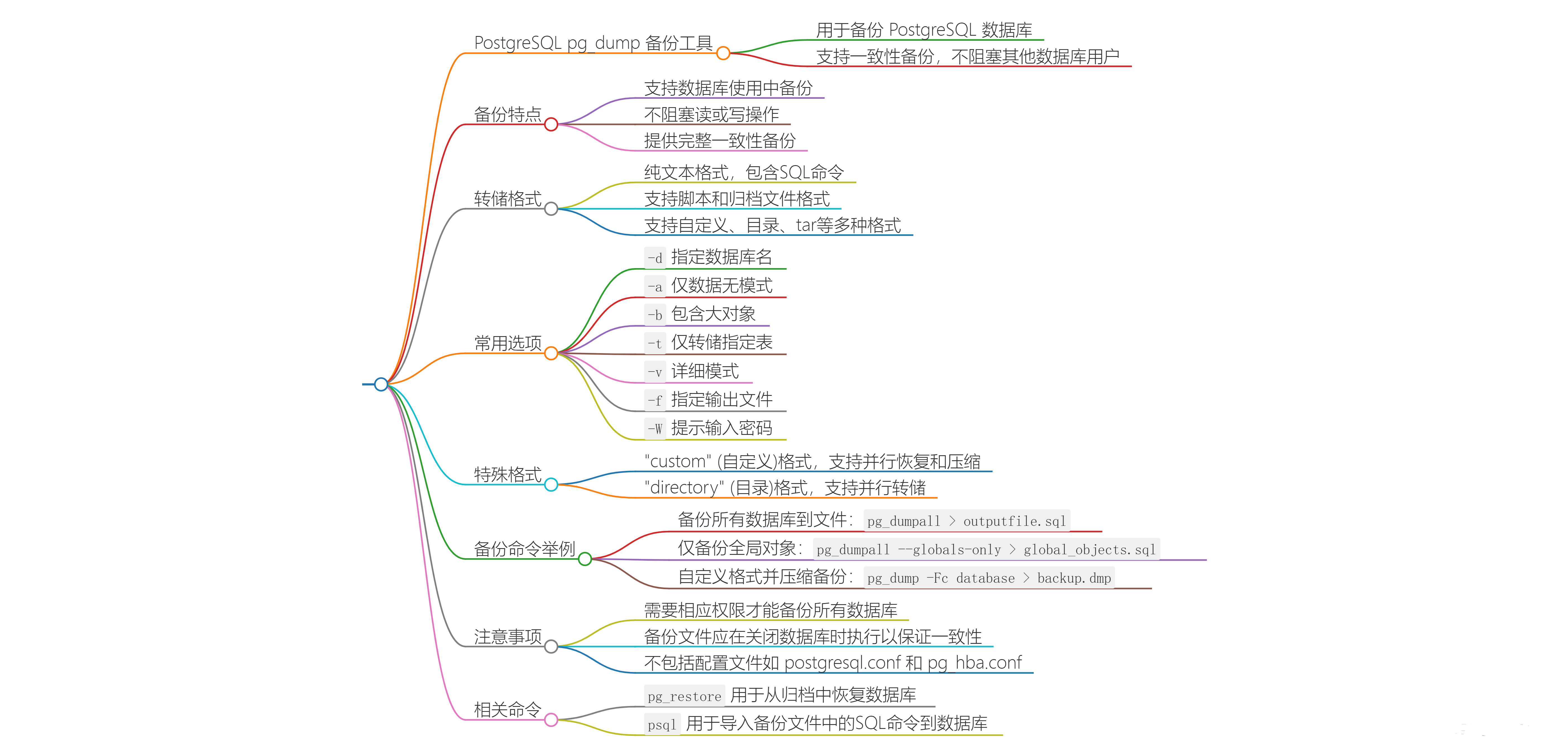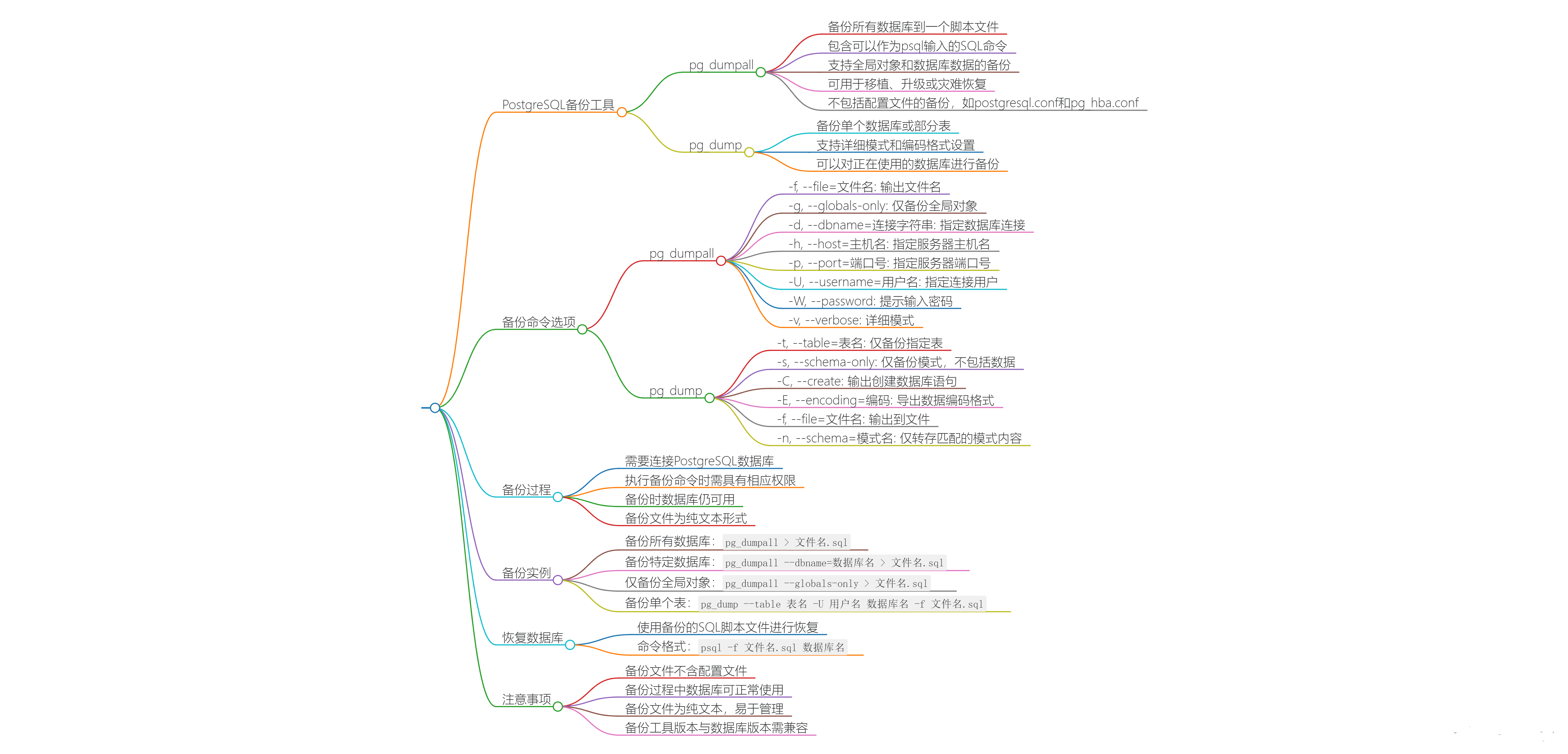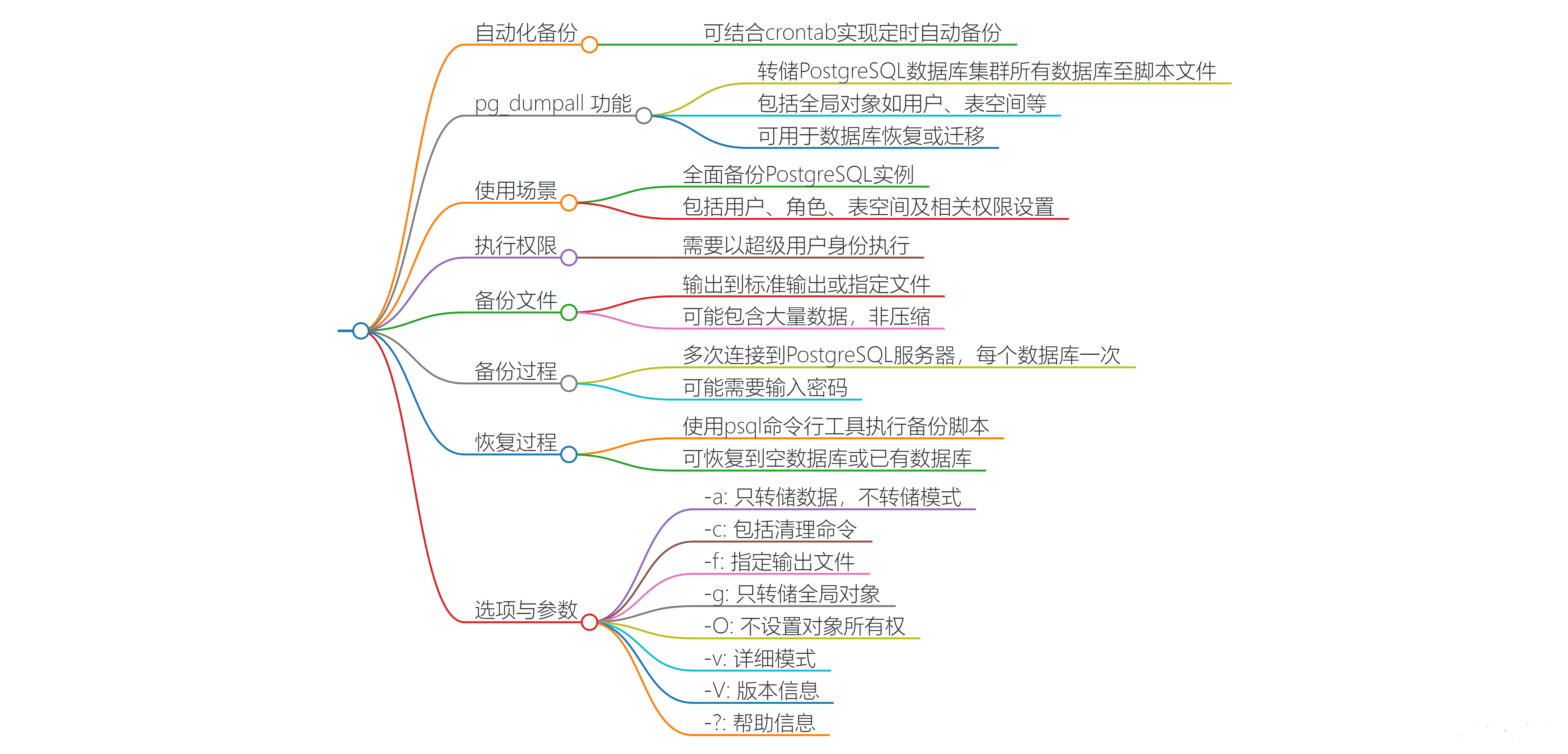 - pg_dumpall 在备份时无法指定备份数据的格式,即无法使用-Fc 这样的参数。此外,pg_dumpall 可以备份整个 PostgreSQL 集群,包括所有数据库和全局对象,而 pg_dump 则用于备份单个数据库或数据库中的特定对象。