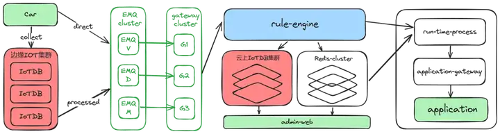 基于 IoTDB 的新方案采用端云协作计算,部分车况数据在终端进行数据整合,也可根据特定需求(如国家采集标准的数据格式转换、周期数据整合等)自行在终端进行简单计算、短期存储。按照配置上传云端,通过规则引擎进行分发后,基于 IoTDB 实时性高的特征,同时进行实时数据推送、实时数据 Redis 存储、历史数据 IoTDB 落库并提供查询接口做数据统一。