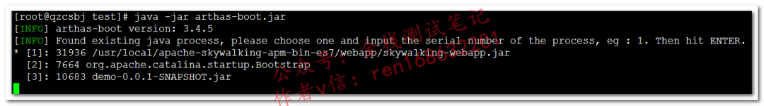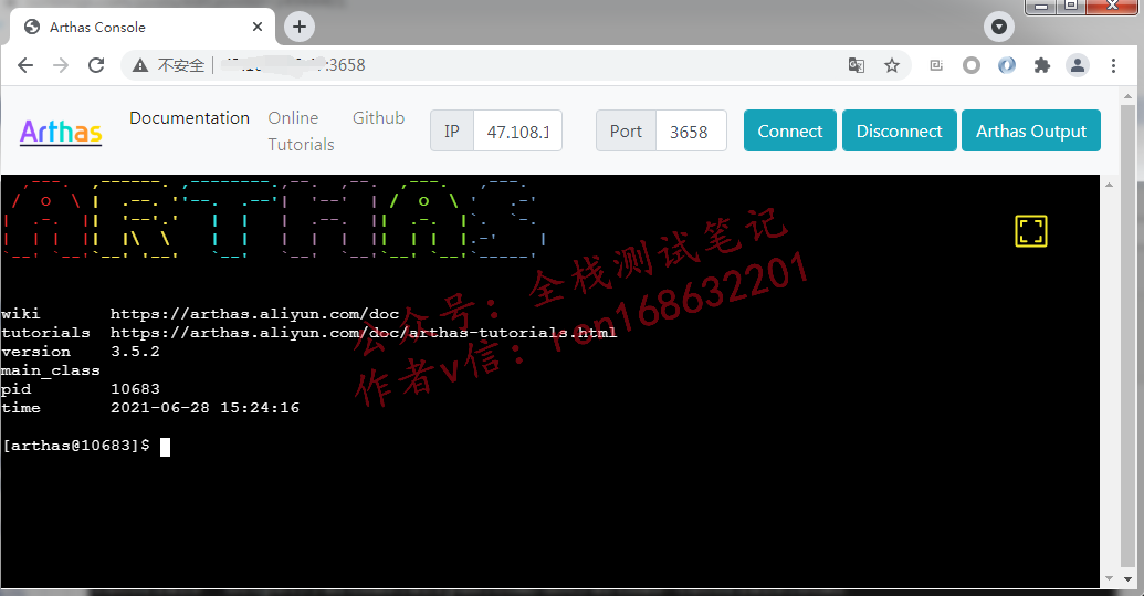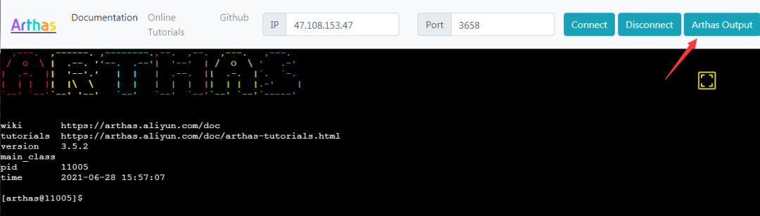 在执行java -jar arthas-boot.jar前,务必先保证有java进程在运行 选择要粘附的进程,输入编号即可,下面输入3后,光标前面显示[arthas@进程号]也可以通过浏览器连接arthas,只是执行命令(java -jar arthas-boot.jar)的时候需要加--target-ip参数dashboard