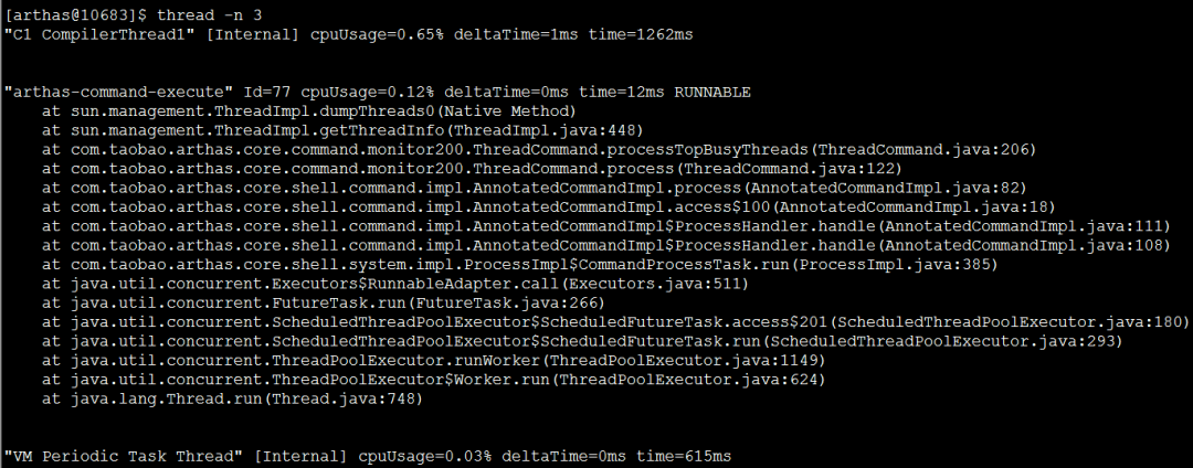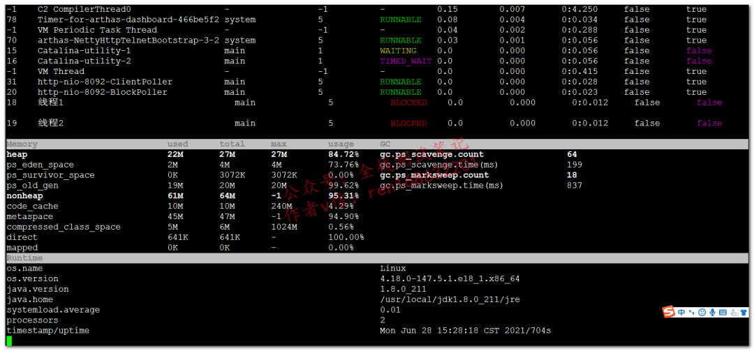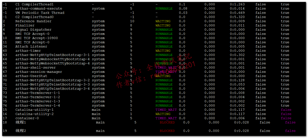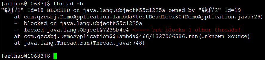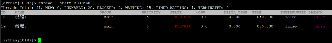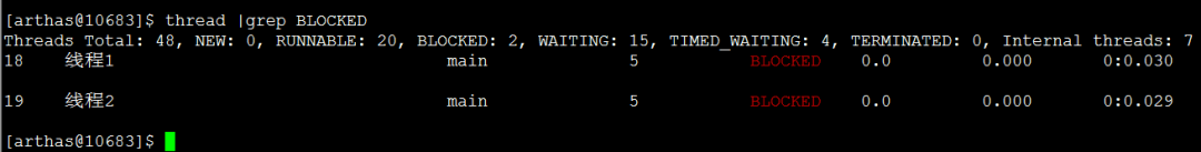 显示粘附的这个进程所有线程信息,和dashboard里面展示的线程一样thread -n 3,最繁忙的3个线程(占用cpu最多的前3个),输出栈信息thread -b,输出阻塞的线程栈信息,如果响应慢,阻塞状态的线程比较多,我们需要重点关注,关于线程的状态如何分析,后续再分享。thread |grep BLOCKED,找出阻塞状态的线程,下面看到有2个thread --state BLOCKED和上面等价jvm