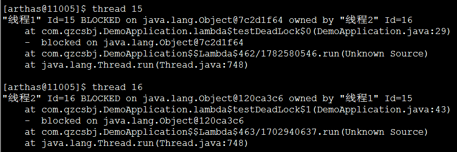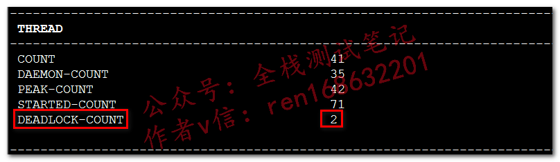 重点关注下死锁(DEADLOCK-COUNT,下面不为0,表示有死锁),jvm相关的,用其它的监控方式(见文末截图)根据下面的栈信息,可以看到,线程15和线程16互相请求被对方占用未释放的资源导致了死锁jad