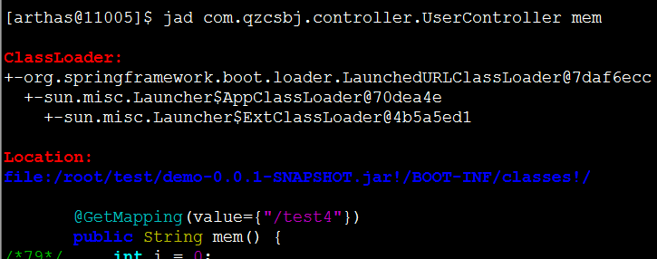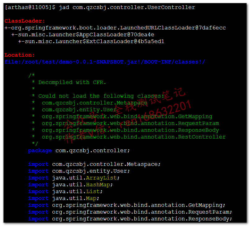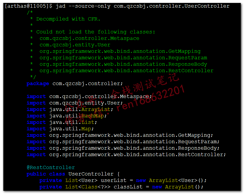 如果没有代码权限,可以使用反编译功能,反编译指定的类或者方法jad com.qzcsbj.controller.UserController mem,反编译指定方法,除了展示代码(演示代码未截全),还展示了类加载器的信息jad com.qzcsbj.controller.UserController,反编译指定的类,除了展示代码(演示代码未截全),还展示了类加载器的信息jad --source-only com.qzcsbj.controller.UserController,不显示类加载器信息,只显示代码(演示代码未截全)sc