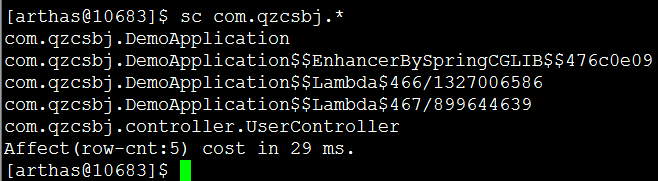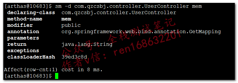 Search Method,查看方法(也可以用jad)sm -d com.qzcsbj.controller.UserController mem,显示方法的详情:修饰符、注解、参数、返回类型trace