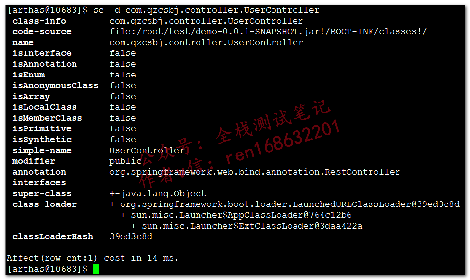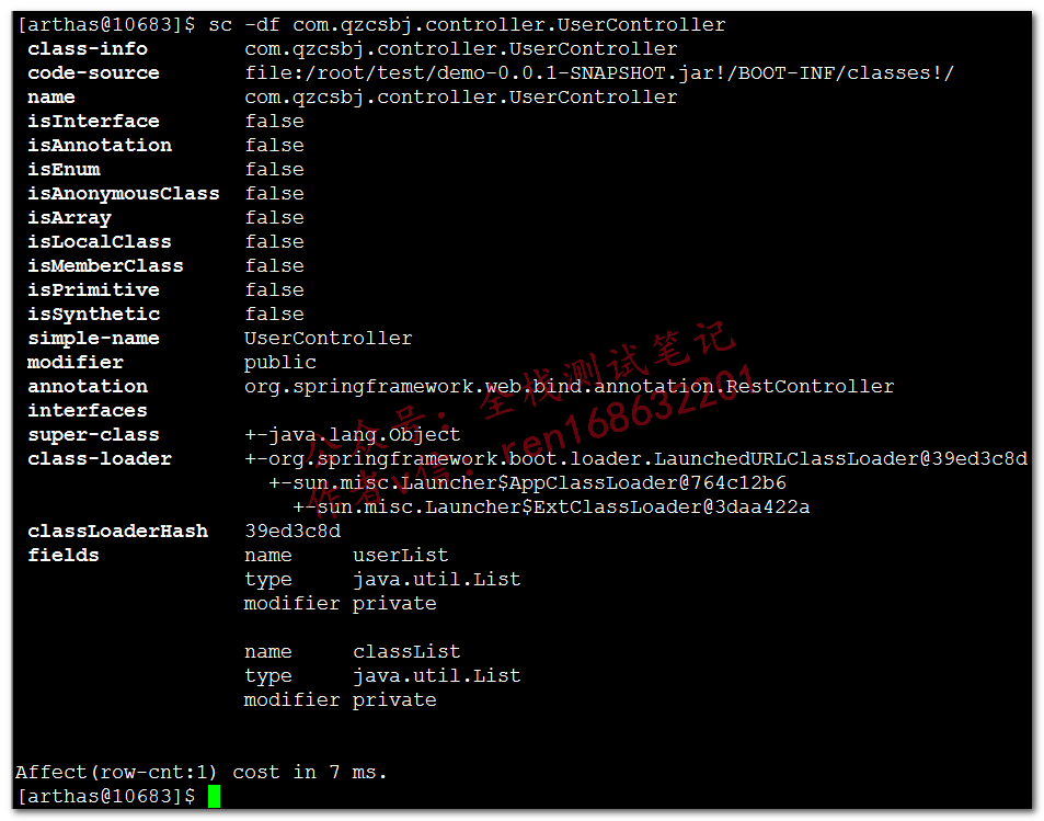 Search Class,查看类信息(也可以用jad)sc -d com.qzcsbj.controller.UserController,根据上图结果,我们来查看类的详细信息下面可以看到类的路径、修饰符、注解、父类、类加载器sc -df com.qzcsbj.controller.UserController,查看类的filed,可以看到其名称、类型、修饰符sm