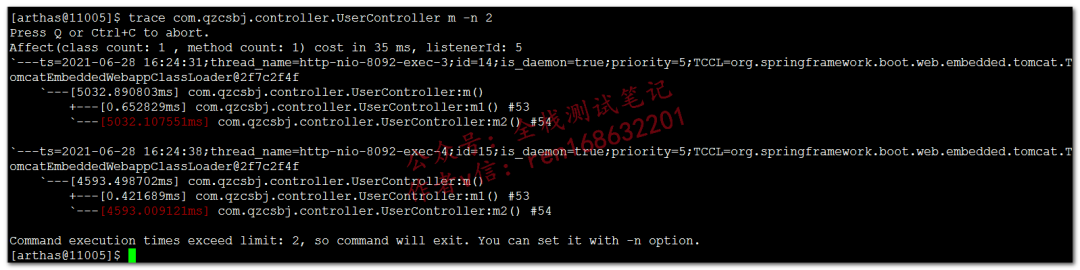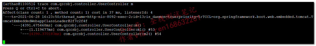 跟踪方法内部调用,输出各个节点的耗时,主要用于响应慢的时候,这个命令非常实用trace com.qzcsbj.controller.UserController m,找到耗时多的方法(下面标红的),然后我们就可以分析代码,看在执行什么操作了,下面会按调用的层次关系列出调用栈trace com.qzcsbj.controller.UserController m -n 2,一般需要输出多次结果,所以这里可以通过-n指定结果数量trace com.qzcsbj.controller.UserController m '#cost>1000',如果输出结果次数比较多,我们还可以对耗时进行过滤monitor以及tt