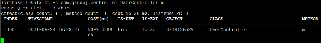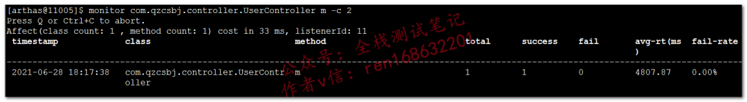 monitor com.qzcsbj.controller.UserController m -c 2,重点看成功次数、平均响应时间、失败率和tt类似,下面关注:耗时、IS-RET为false表示失败watch
