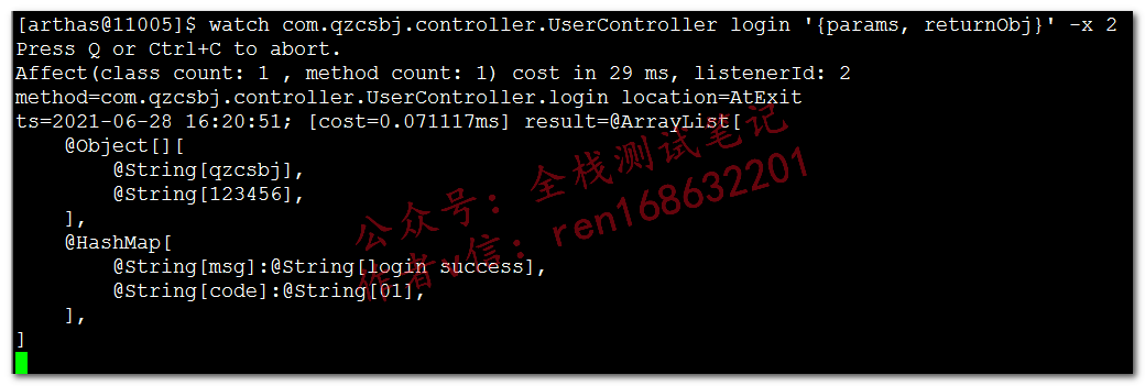 watch com.qzcsbj.controller.UserController login '{params, returnObj}' -x 2,其中-x表示深度入参是qzcsbj、123456,返回是msg、codeprofiler(火焰图)
