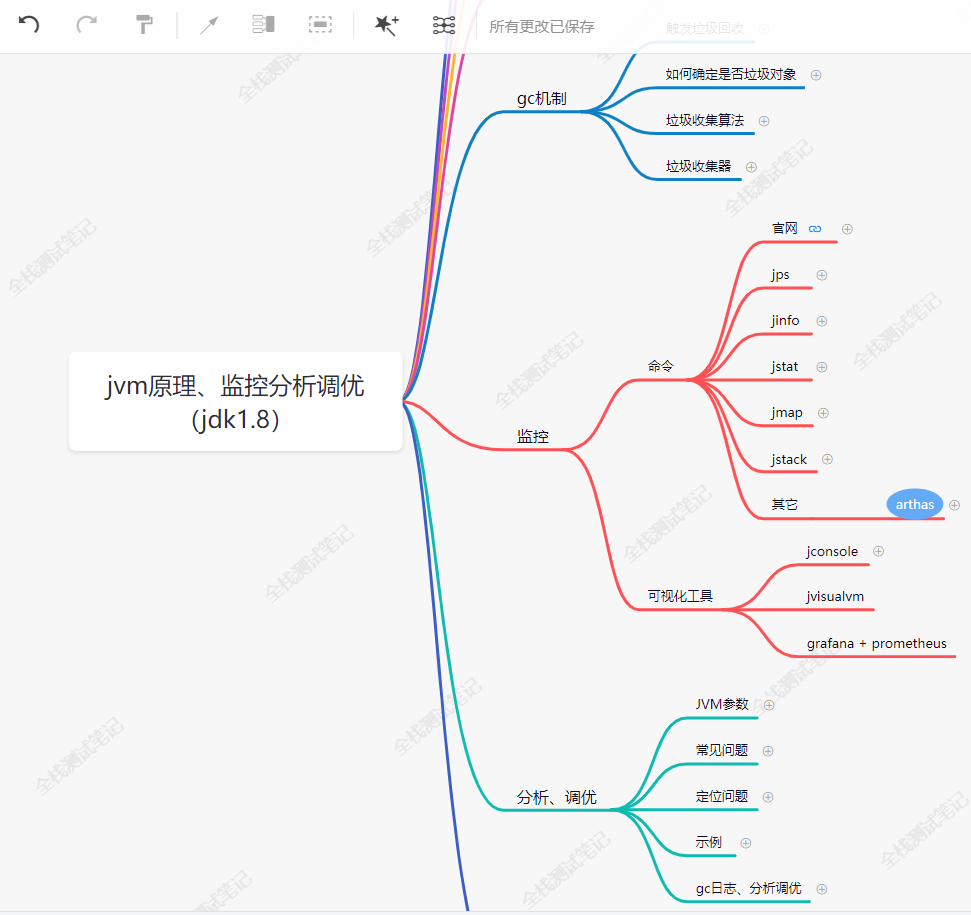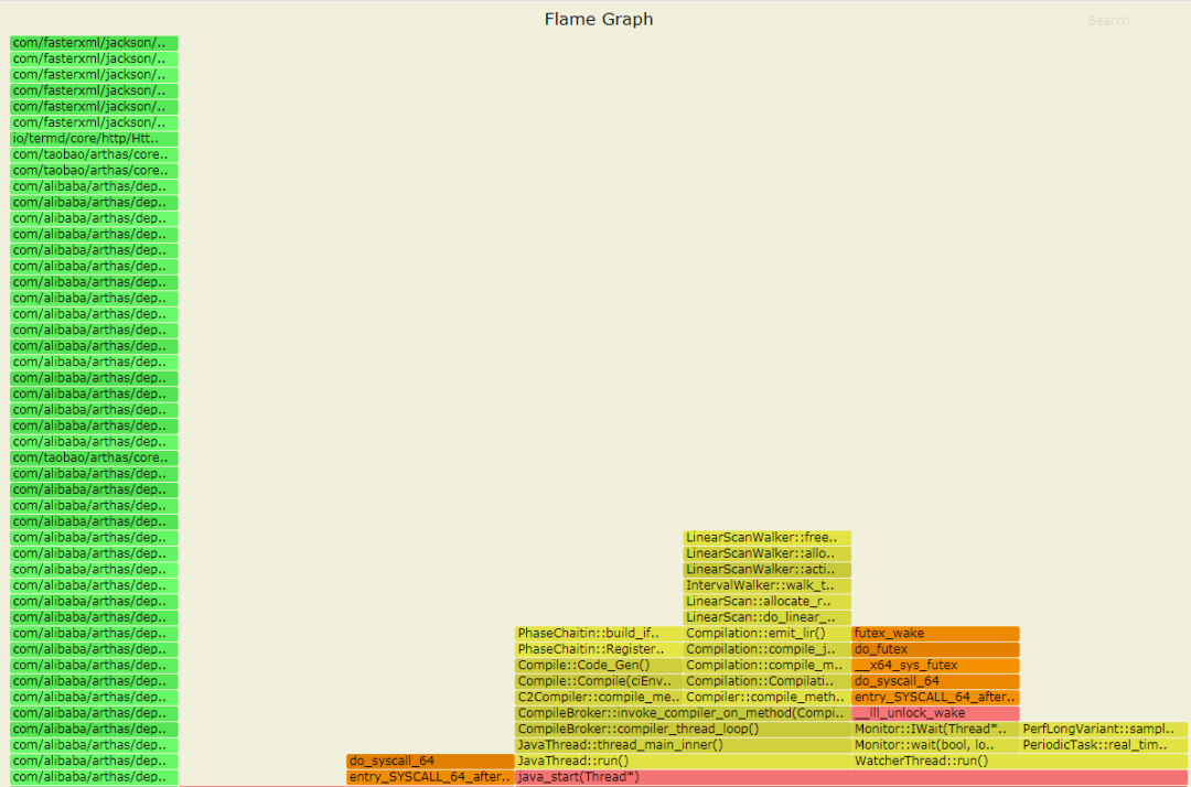 系统cpu高的时候,我们可以看系统调用,相比于perf命令,profiler的步骤要更简单点,profiler start,启动,默认是生成cpu的火焰图,which event to trace (cpu, alloc, lock, cache-misses etc.), default value is cpuprofiler stop,停止,可以看到生成的svg文件路径然后通过浏览器访问,点击右上角"Arthas Output"关于如何看火焰图,我们是看顶层最宽的,看内核在做什么操作。在做性能测试的时候,针对java应用,单纯靠arthas是不够的,下面这些知识也需要掌握,建议大家自己梳理。