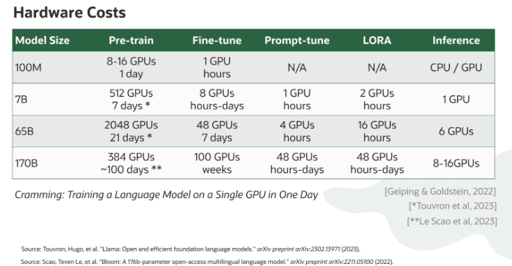 模型训练需要耗费硬件成本,最后给出一个基于OCI的不同训练方法的硬件成本。