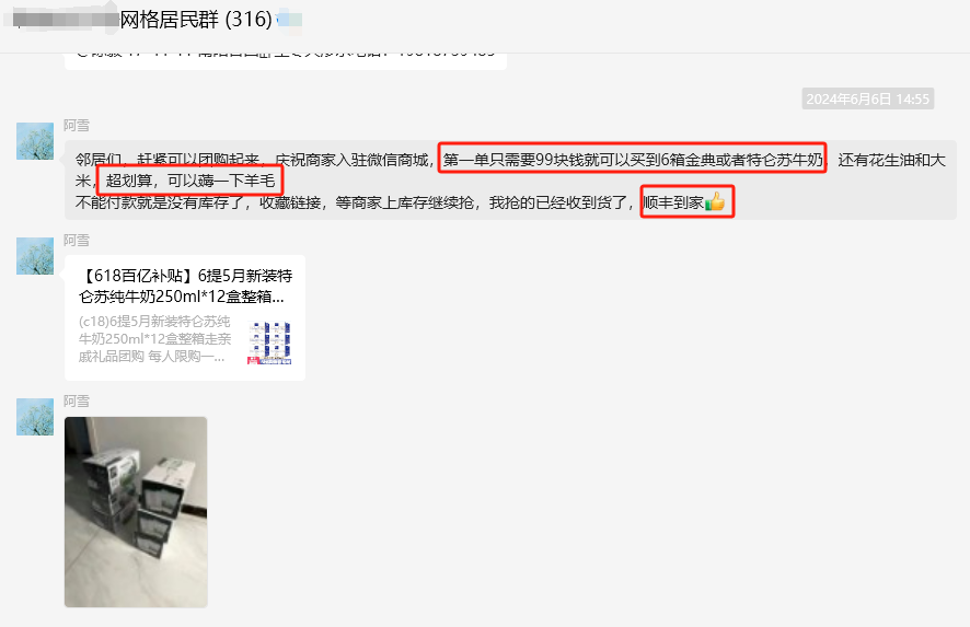 第一条:“邻居们,赶紧可以团购起来,庆祝商家入驻微信商城,第一单只需要99块钱就可以买到6箱金典或者特仑苏牛奶,还有花生油和大米,超划算,可以薅一下羊毛不能付款就是没有库存了,收藏链接,等商家上库存继续抢,我抢的已经收到货了,顺丰到家” 第二条:上链接。 第三条:6箱金典牛奶上门的照片。