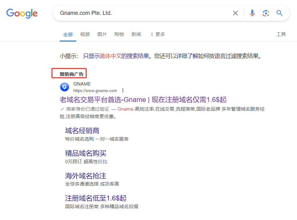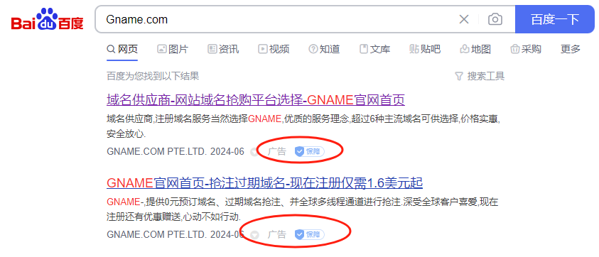 一查不得了,其域名注册网站是 Gname.com。这货竟然在某度和 Google 都打了广告。