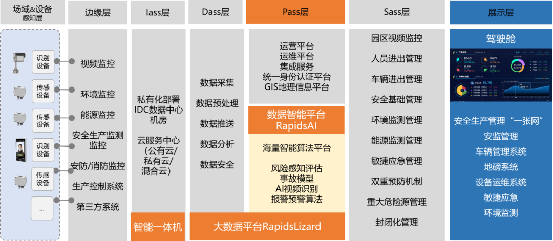 柏睿安全生产AI管控平台囊括柏睿大数据平台RapidsLizard和数据智能平台RapidsAI等软件设施,集成国产化AI芯片板卡、无线网桥、智能一体机、大屏显示终端等硬件设备,融合海量智能算法。通过充分利用原有厂区摄像头实现智慧化升级,能够满足64路、百路级以上等视频分析需求。