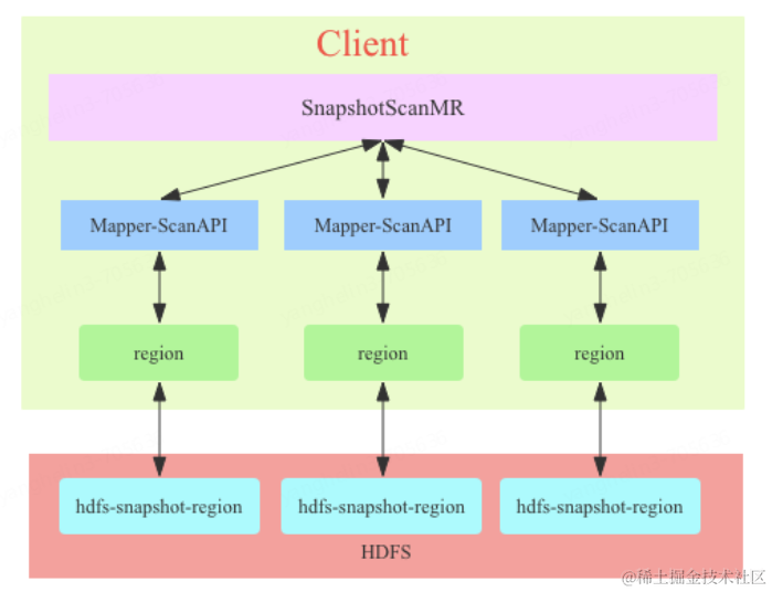 2.SnapshotScanMR直接会在客户端打开region扫描HDFS上的文件,不需要发送Scan请求给RegionServer,再有RegionServer扫描HDFS上的文件。在客户端直接扫描HDFS上的文件,这类scanner称之为ClientSideRegionScanner。