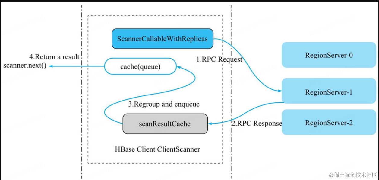 使用ScanAPI获取Result的流程如下,在上面的demo代码中,table.getScanner(scan)可以拿到一个scanner,然后只要不断地执行scanner.next()就能拿到一个Result,客户端Scan的核心流程如下