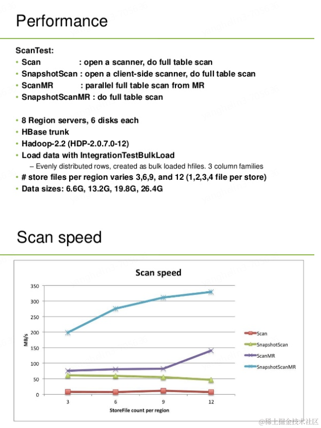 2.极大的提升了扫描效率。SnapshotScanMR相比TableScanMR在扫描效率上会有2倍~N倍的性能提升(下一小节对各种扫描用法性能做个对比评估)。主要原因如下:扫描的过程少了一次网络传输,对于大数据量的扫描,网络传输花费的时间是非常庞大的,这主要可能牵扯到数据的序列化以及反序列化开销。TableScanMR扫描中RegionServer很可能会成为瓶颈,而SnapshotScanMR扫描并没有这个瓶颈点。