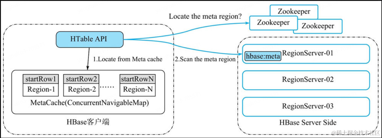 为了解决如果所有的流量都先请求hbase:meta表找到Region,再请求Region所在的RegionServer,那么hbase:meta表的将承载巨大的压力,这个Region将马上成为热点Region这个问题,HBase会把hbase:meta表的Region信息缓存在HBase客户端。在HBase客户端有一个叫做MetaCache的缓存,在调用HBase API时,客户端会先去MetaCache中找到业务rowkey所在的Region。