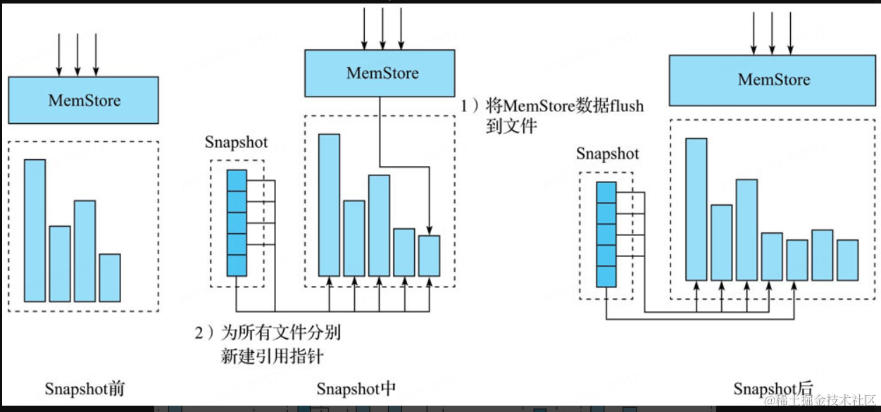 Snapshot机制并不会拷贝数据,可以理解为它是原数据的一份指针。在HBase的LSM树类型系统结构下是比较容易理解的,我们知道HBase数据文件一旦落到磁盘就不再允许更新删除等原地修改操作,如果想更新删除只能追加写入新文件。这种机制下实现某个表的Snapshot,只需为当前表的所有文件分别新建一个引用(指针)。对于其他新写入的数据,重新创建一个新文件写入即可。如下图所示