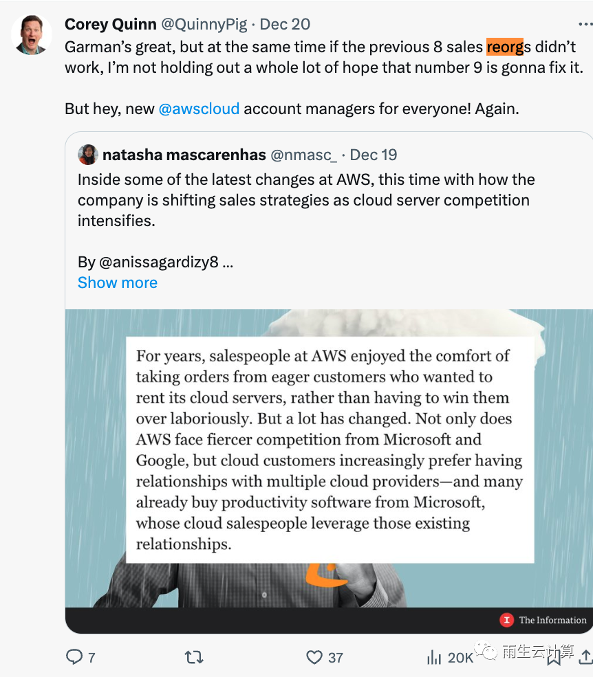 12月20号 雨生人当时还在HK,听闻AWS 全球 reorg 重组影响6万人 还觉得惊讶