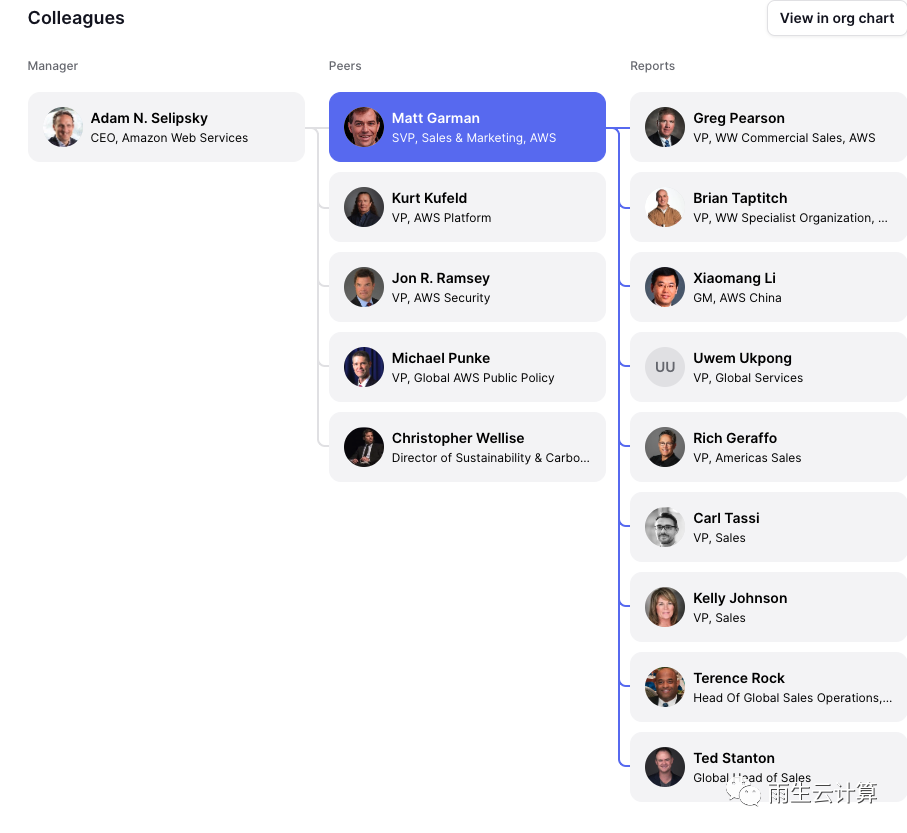 根据 theorg 的数据显示,中国区的 Xiaomang Li 直接汇报给全球的 Matt Garman
