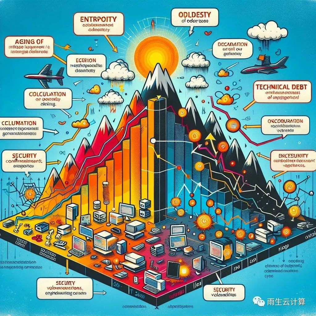熵增(Entropy Increase)在这里可以被用作一个比喻,描述随着时间的推移,一个IT系统可能会变得越来越无序和混乱。这种无序可能是由于多种因素造成的,比如系统的老化(过时的技术)、技术债务的累积、缺乏有效的维护和管理、配置的不一致性、安全漏洞等。熵增可以导致系统效率下降、出错率提高、安全风险增加以及运维成本上升。