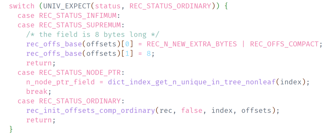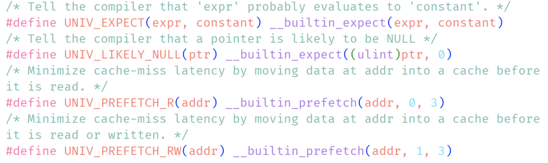 上述代码就是判断status这个变量大概率的值是REC_STATUS_ORDINARY,因此在编译阶段就会对上述代码进行优化,让 CPU 可以提前执行,从而提升效率。宏 UNIV_EXPECT 就是对 GCC 提供的分支预测函数 __builtin_expect 进行的封装。