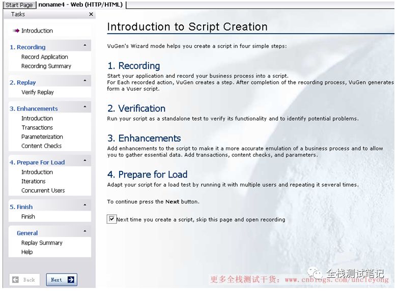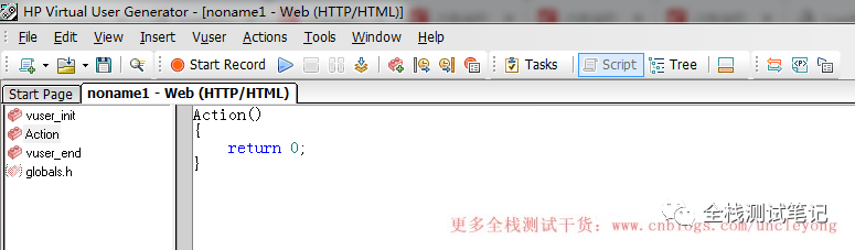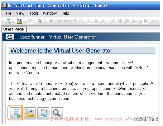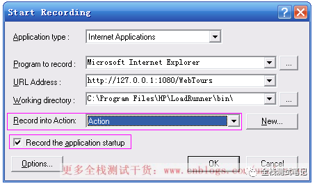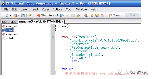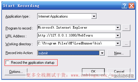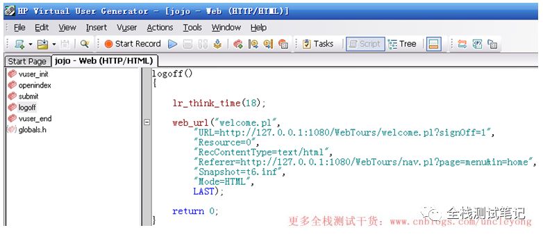 loadrunner只关注底层数据,即监控客户端和服务器端之间发送了什么数据,而不关注业务、也不关注客户端动作;不关注业务:脚本运行正确不一定业务就正确,也就是说不是我们期望的业务结果,脚本运行正确只能说明服务器做了响应,但是响应的内容不一定符合业务需求;怎么判断业务是否正确呢?如果是查询,我们可以通过添加检查点来判断;如果是增、删、改操作,可以对比通过的事务数和数据库中数据增、删、改的数量来判断;不关注客户端动作:比如下载图片,用loadrunner请求要下载的图片的页面,对于在图片上“右键→另存为…”,loadrunner不能完成这些动作(如果是录制脚本就可以观察到,执行这些动作的时候,客户端和服务器没有数据通信,因为loadrunner只关注数据传递,而不关注动作); 备注:录制是每个初学loadrunner的同学的必经之路,会遇到很多坑,真的很折磨人,本人只在以前学习的时候用过录制,受环境影响,有时录制不到脚本或者录制过程中卡死,所以,在实际工作中,都是直接写脚本(这个后续分享),不用loadrunner的录制功能,直接写loadrunner脚本也不是大家想象中的那么难,还是有些偷懒的小技巧的,但是,为了帮助想学录制的朋友,本篇我们还是会通过实战介绍如何录制脚本。 a.为每个action插入注释,这样增加脚本的可读性以及易维护性;安装好loadrunner,我们就可以实践了。安装包请加Q群652122175获取,安装参考:https://www.cnblogs.com/uncleyong/p/10698925.htmlloadrunner自带订票网站,可以方便我们练习首先,启动服务,点击下面图标(如果服务无法启动,检查端口是否被占用)选择协议,因为订票网站是http协议的,这里我们选择Web(HTTP/HTML)鼠标点在下图左侧哪个文件,录制的脚本就放到对应的文件中,另外,vuser_init和vuser_end里面的脚本只执行一次 Internet Application是指我们需要录制的对象是一个网络应用(B/S) Win32 Application是用来支持Win32的标准客户端的(C/S) 我们需要录制的程序名,LoadRunner默认支持的Web客户端是IE 我们录制的内容放在哪个Action中,Action是LoadRunner提供的一种类似于函数的脚本块,我们通过将不同的操作存放在不同的Action中实现代码的高内聚低耦合 Vuser_init存放LoadRunner中用户的初始化操作 Vuser_end存放LoadRunner中用户的结束操作 Record the application startup勾选,表示一旦启动了应用后就将开始录制我们应用收发的协议数据;不勾选,一般在补录的时候用,到需要录制的地方,点击【Record】即可上图点击【OK】,打开首页,这里我们只录制访问首页的脚本。直到网页左下角显示“完毕”才点击停止。