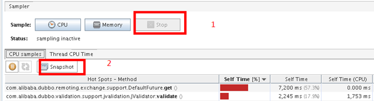 抽样进行一段时间后(一般1-2分钟即可),点击“stop”,然后点击“snapshot”生成快照
