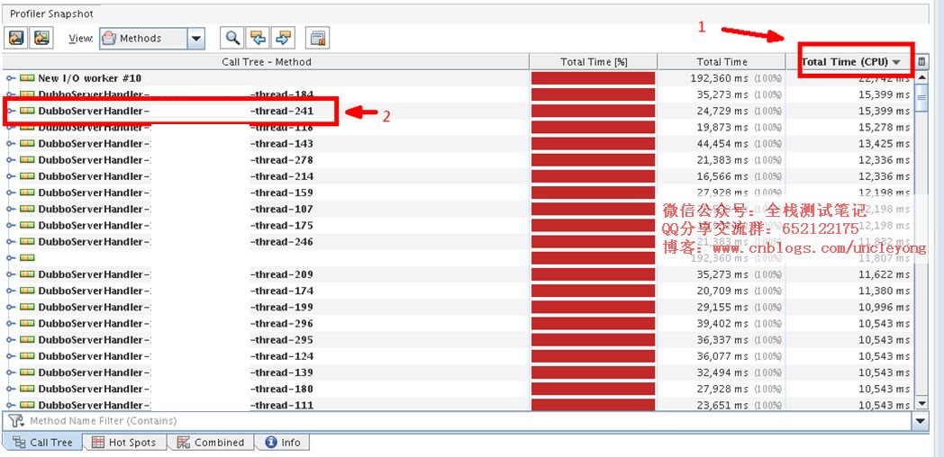 接着按照“Total Time(CPU)”排序,看哪些线程最耗费cpu,因为我们用的是dubbo框架,所以,我们要分析的业务线程就是DubboServerHandler。分析的时候,我们需要多看几个DubboServerHandler线程,双击指定线程就可以看这个线程的调用栈以及耗时情况,看看这些线程在哪里比较耗费cpu