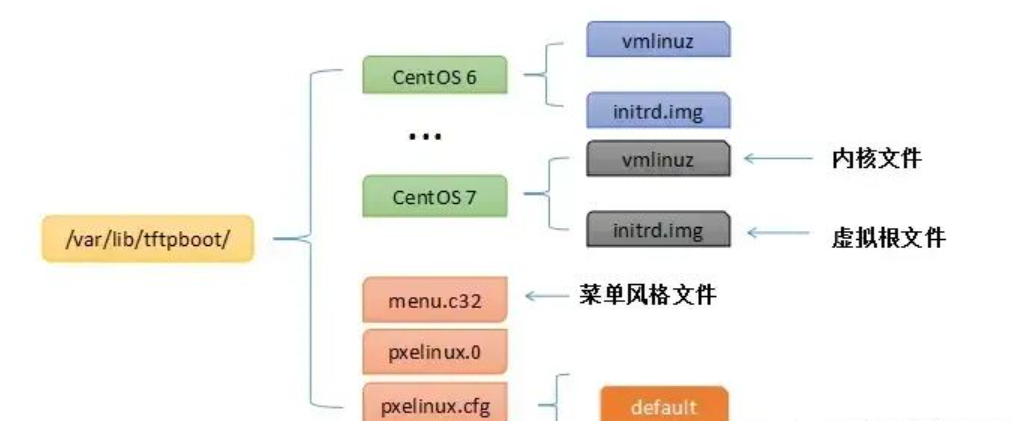 内核文件、虚拟根文件以及菜单文件,我们都是通过tftp服务来提供的,由于系统及版本的不同,对于一个比较复制机群来说,我们需要准备不同系统,不同版本的内核文件,initrd.img文件。菜单文件只需要一份即可。/var/lib/tftpboot/目录规划如下: