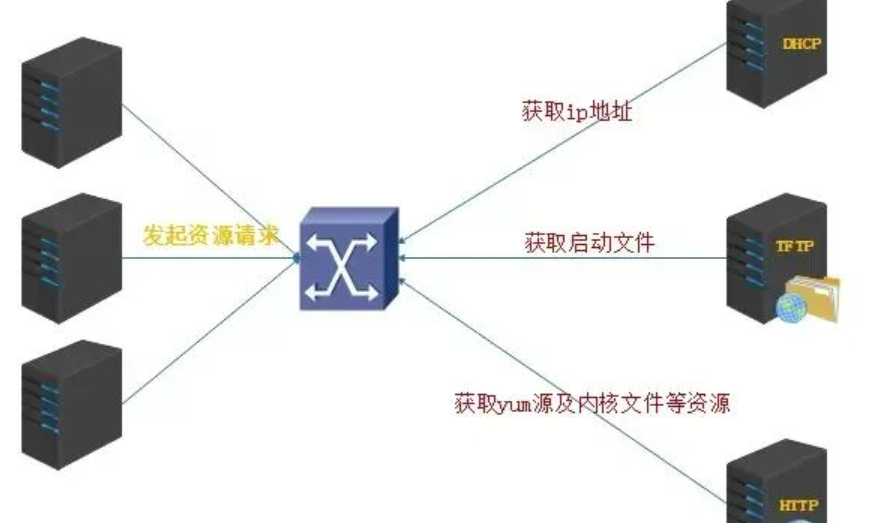 这一小节我们主要介绍方案选择,在说方案之前先来看看PXE部署思路。部署思路其实并不难,在实现PXE自动批量安装系统时,首先我们需要有DHCP服务器为我们提供IP地址,如果在一个网络中你连IP地址都获取不到,何谈自动化。其次我们要安装一个系统,那么需要的文件必须要有人为我们提供才可以,应为是网络自动安装,本地是没有任何资源的,我们可以使用HTTP,FTP服务来实现。最后就是获取我们的安装文件,这些文件会引导我们的计算机如何启动,如何配置,我们选择TFTP服务起来提供。整体框架如下图: