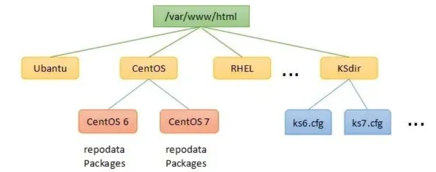 yum源文件我们是放在http服务器上的,由http服务来提供,所以我们要把相应的文件复制到http服务器上。并且我们安装的主机系统可能是CentOS 6 也可能是CentOS7或者Ubantu等,所以我们在准备yum文件时,需要准备不同系统、不同版本的文件,我们这里只提供CentOS 6 与CentOS 7的两种系统的安装。向我们先规划一下目录文件,在进行复制。如下所示。
