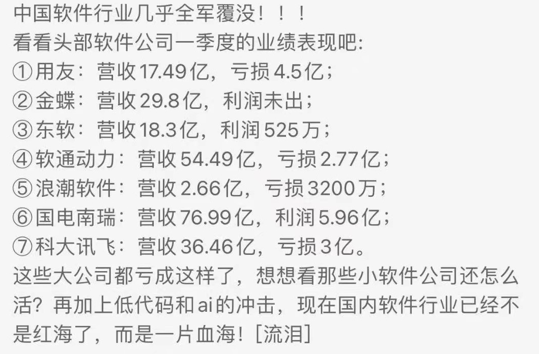 上面截图是最近网上一个比较火的话题,有网友列出一系列头部软件企业一季度业绩,普遍亏损。引起了众多网友又是对中国软件一阵悲悯。也有很多批评的声音,指出当前这些头部软件公司普遍是靠和客户喝大酒获得订单,并不是靠产品能力。