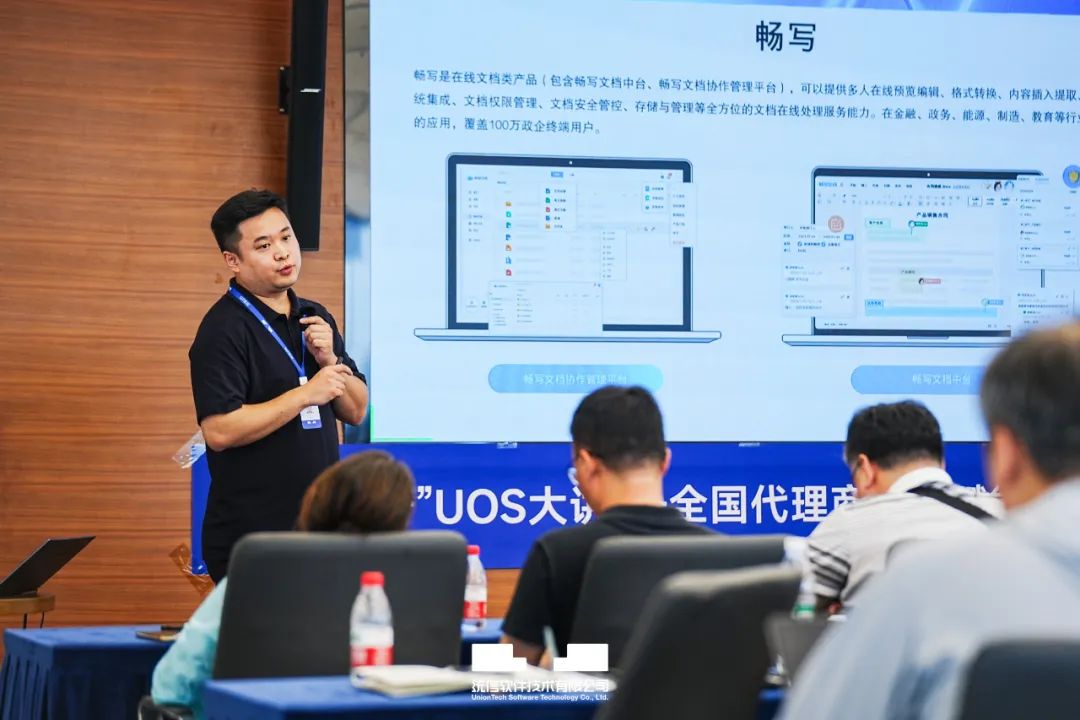 统信软件畅写产线销售总监杨方超带来了畅写产品的详细介绍及销售策略分享,通过生动的案例和实用的销售策略,让代理商伙伴们更加深入地了解畅写产品的优势与价值,并介绍如何将其应用于实际销售。