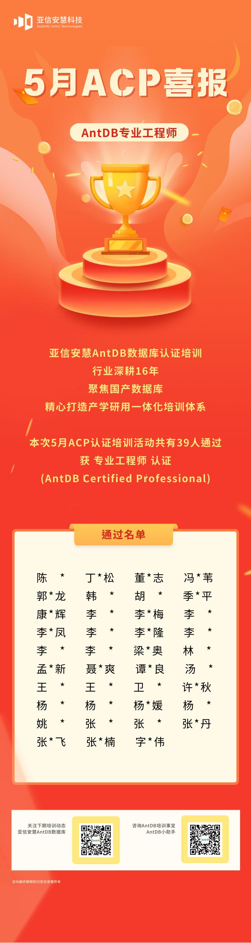 日前,亚信安慧AntDB数据库团队成功举办了5月ACP(AntDB Certified Professional)认证培训活动,众多参与者顺利通过AntDB数据库中级认证,并荣获了“AntDB专业工程师”的称号。该称号的获得,不仅验证了各位学员的专业技能,也彰显了他们对于数据库管理的卓越追求。