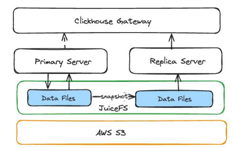 于是,Jerry 采纳了 JuiceFS, 并创新性地使用其快照功能实现了 ClickHouse 主从架构。这一架构不仅确保了数据的高可用性和稳定性,还显著提高了系统的性能和数据恢复能力。在超过一年的时间里无停机和无复制错误,并提供了可预期的性能。