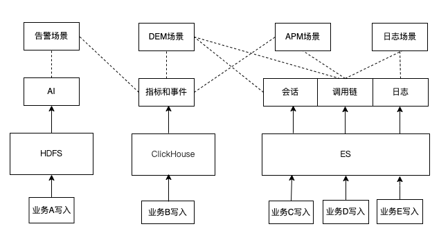 Bonree ONE是博睿数据发布的一体化智能可观测平台,融合了指标、调用链、日志、会话、事件等多种数据。早期时候,调用链、会话、日志的数据存到了Elasticsearch。我们历史架构如下图,大数据团队需要维护多种存储。比如,告警业务A说要做AI训练,就得自己加工一份时序数据到HDFS,指标中心业务B说加工指标,就自己加工一条链路到ClickHouse,DEM业务C想做会话分析,APM业务D又想做调用链分析,日志业务E还想做日志分析,那么业务C、D、E就分别加工各自数据到ES,这就导致完全各自业务各自加工存储。这样烟囱式的发展到一定程度后,数据不好管理,资源浪费严重,并且各业务之间数据很难做关联式的统计和分析(比如用户的网络请求和后端调用链关联的多端打通场景),产品迭代越来越重。即使在产品web页面看起来能展示到一起,但下面架构和数据已经到了盘根错节的程度,对于千亿级、万亿级甚至更多的数据非常难治理,产品在私有化大B客户项目交付时更成为不可控的空中楼阁。