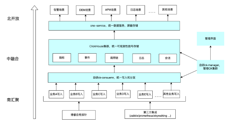 经过烟囱式架构重构改造,我们把ClickHouse集群横向作为可观测性所有信号数据的统一存储,用自研的ck-consumer组件统一在存储写入层做了封装,做了精细化的攒批优化和脏数据阻断,让所有数据均衡写入ClickHouse集群,用自研的 ck-manager组件管理ClickHouse集群的状态、资源隔离、DDL、高可用容错等能力,用自研的one-service组件做了统一数据服务,屏蔽了存储(尤其对于信创改造收益较大),用自研的平台管理界面丰富了ClickHouse的拓扑信息、全方位自监控和告警、SQL执行、分区管理、配置管理、任务管理、TTL过期管理策略、磁盘预估策略等运维工具能力。这样先从架构数据上做好融合,把复杂交给底座引擎,把简单留给业务,让业务高效迭代。
