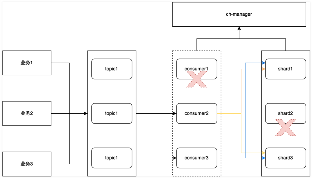 当consumer节点或者ClickHouse节点遇到异常时,manager节点能够感知到节点异常进行流量调度,使异常节点不影响数据正常摄入和查询,同时调整流量写入策略,保证consumer节点写入的稳定性,避免发生级联雪崩状况。
