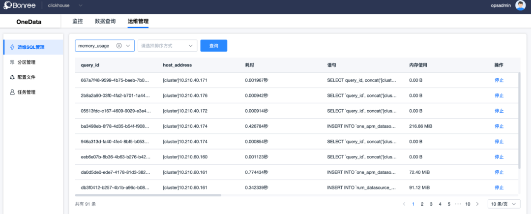 我们基于manager组件研发了ClickHouse集群的运维工具,目前可以做SQL任务管理、配置管理、分区管理、数据迁移等。方便在私有云场景对故障能有干预能力。