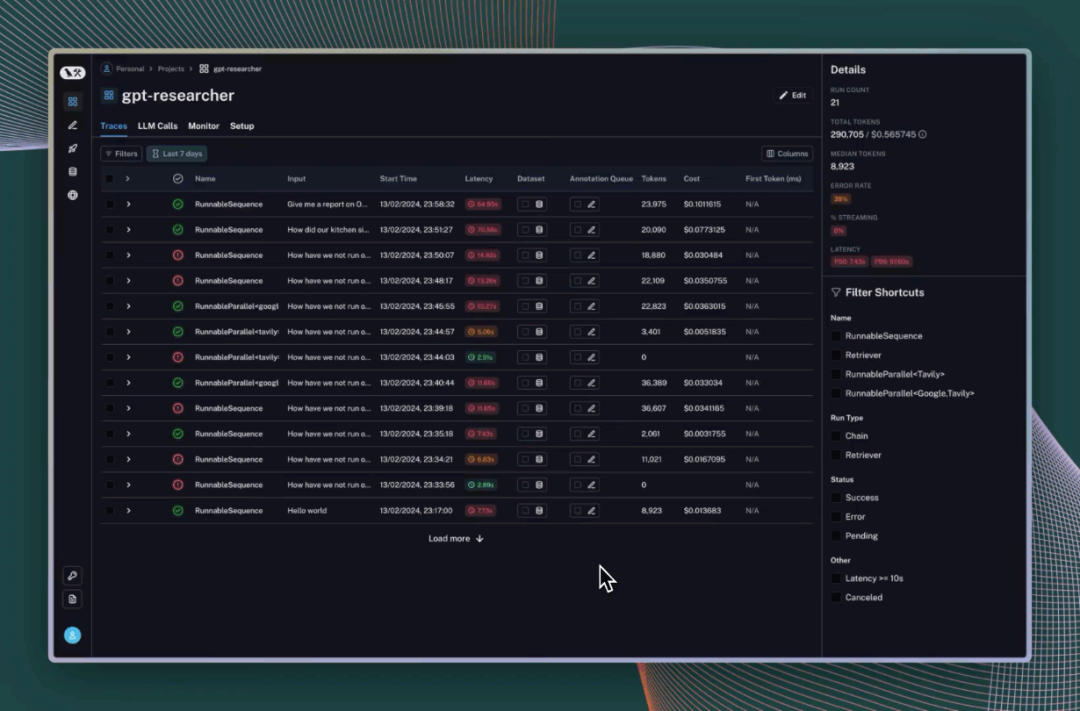 在处理 LLM 应用时,通常会涉及许多组件,包括链式 API 调用和决策流程。这使得理解底层发生的情况变得具有挑战性,用户需要调试无限的代理循环或存在过度使用 Token 的情况。鉴于这里存在明显的需求,LangSmith 最初作为一个可观测性工具,旨在通过在 LLM 序列的每一步提供清晰的可见性和调试信息,帮助开发人员诊断和解决这些问题。