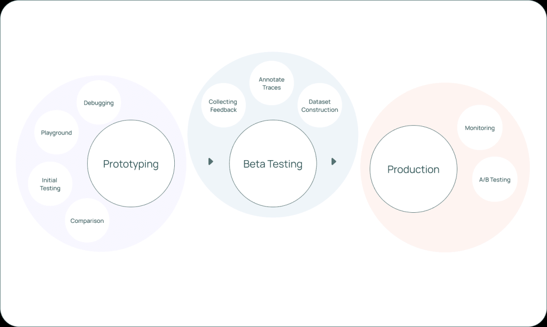 LangSmith 在 LLM(大语言模型)应用生命周期的每个阶段支持的工作流程