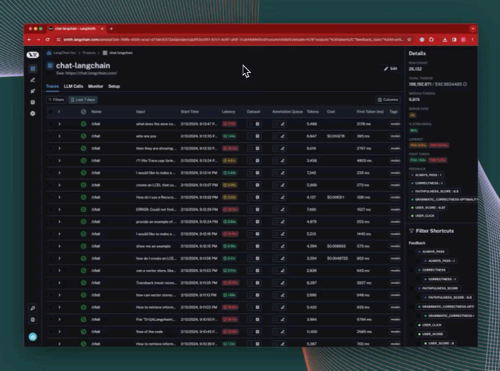 从 ChatLangChain 记录跟踪和反馈评分,然后在 LangSmith 中查看结果。