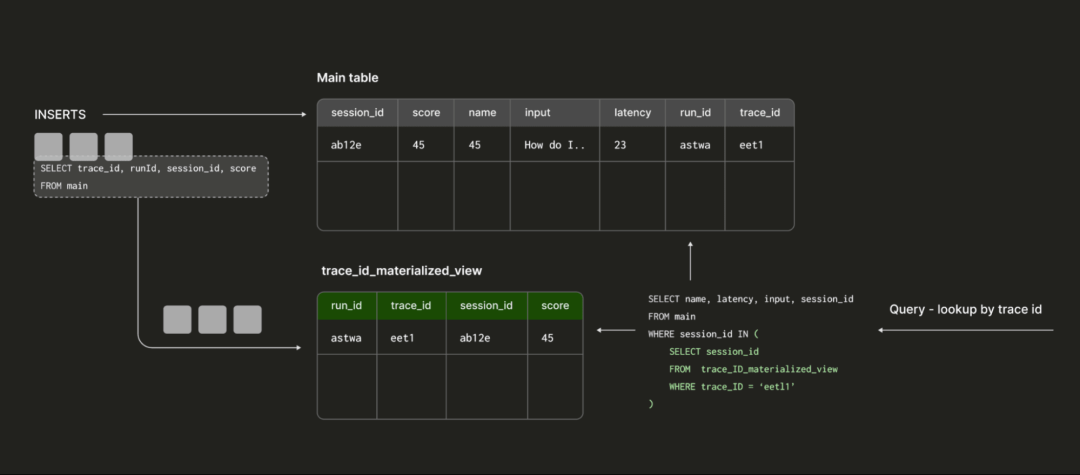 为了避免这种情况,LangChain 使用了一种材料化视图的方法,其中目标表包括跟踪 ID 和运行 ID 作为排序键的一部分。这些表中存储的行具有列,这些列是主表的排序键。这使得 LangChain 几乎可以将这些视图视为反向索引,根据跟踪 ID 或运行 ID 查找主表的排序键值。然后,对主表的最终查询包括一个过滤器,可以用于最小化扫描的行数。