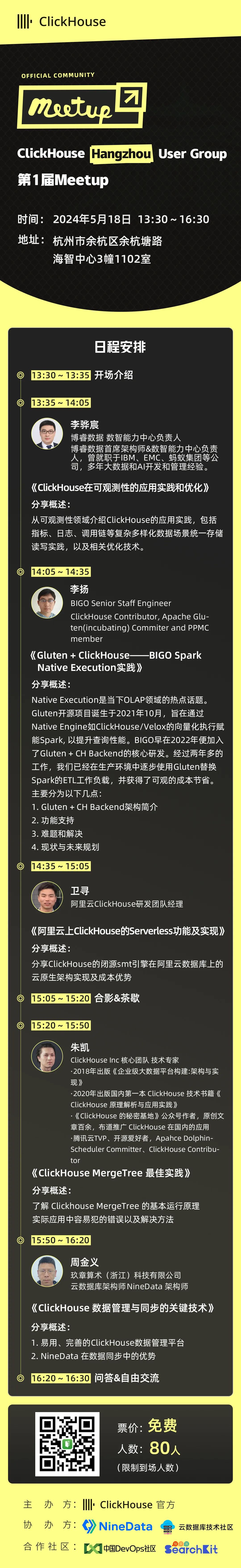 ClickHouse Hangzhou User Group第1届 Meetup 火热报名中,详见文末海报!